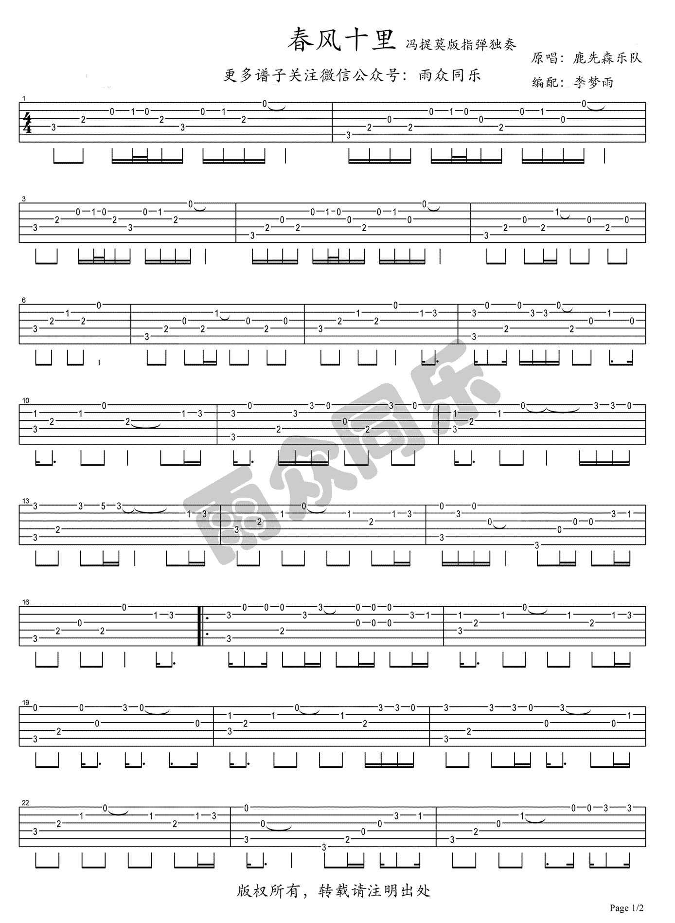 春风十里指弹吉他谱冯提莫版本感谢雨众同乐编配制谱。...