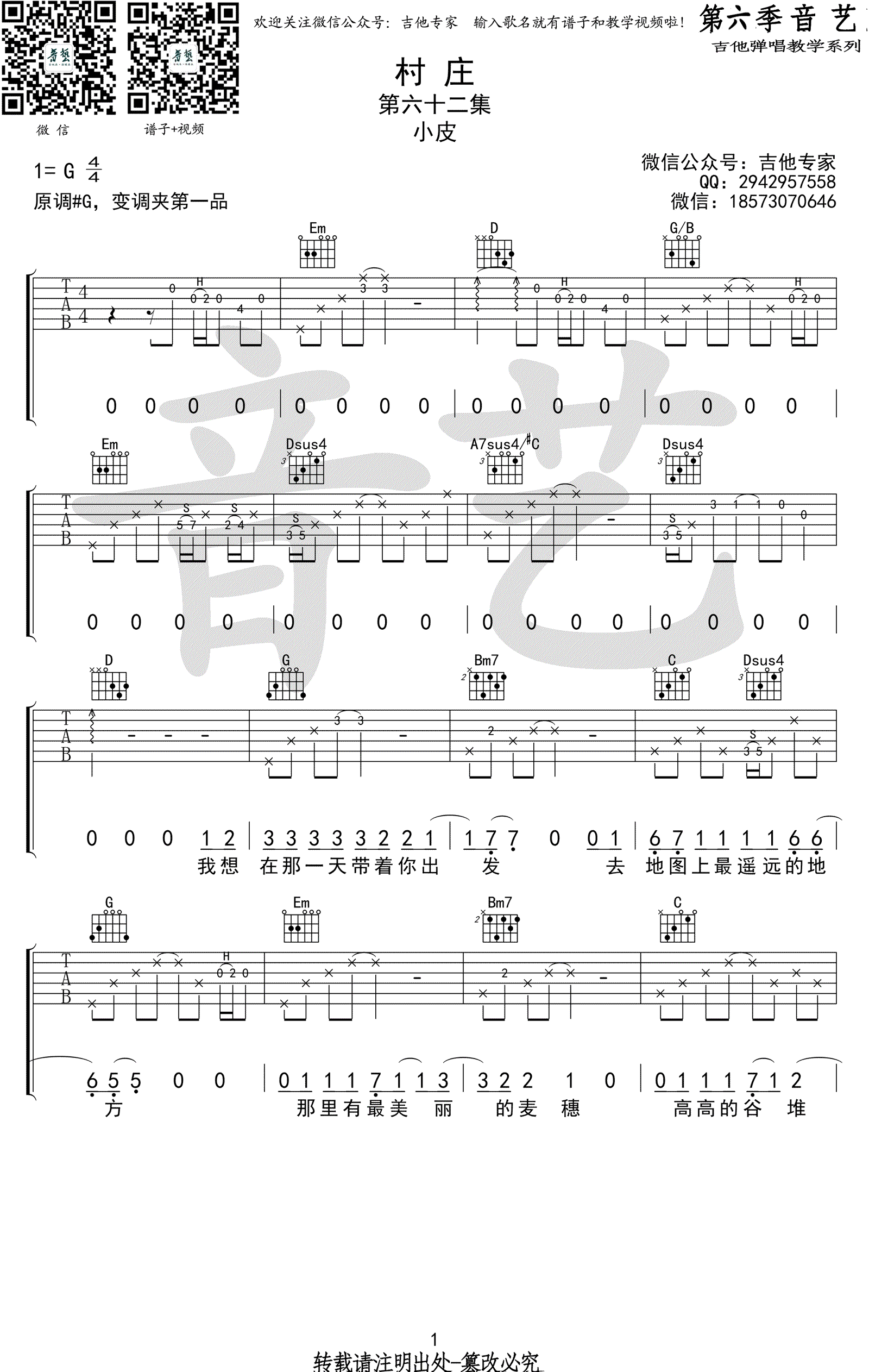 村庄吉他谱吉他谱小皮变调夹夹一品。感谢音艺吉他编配出品。...