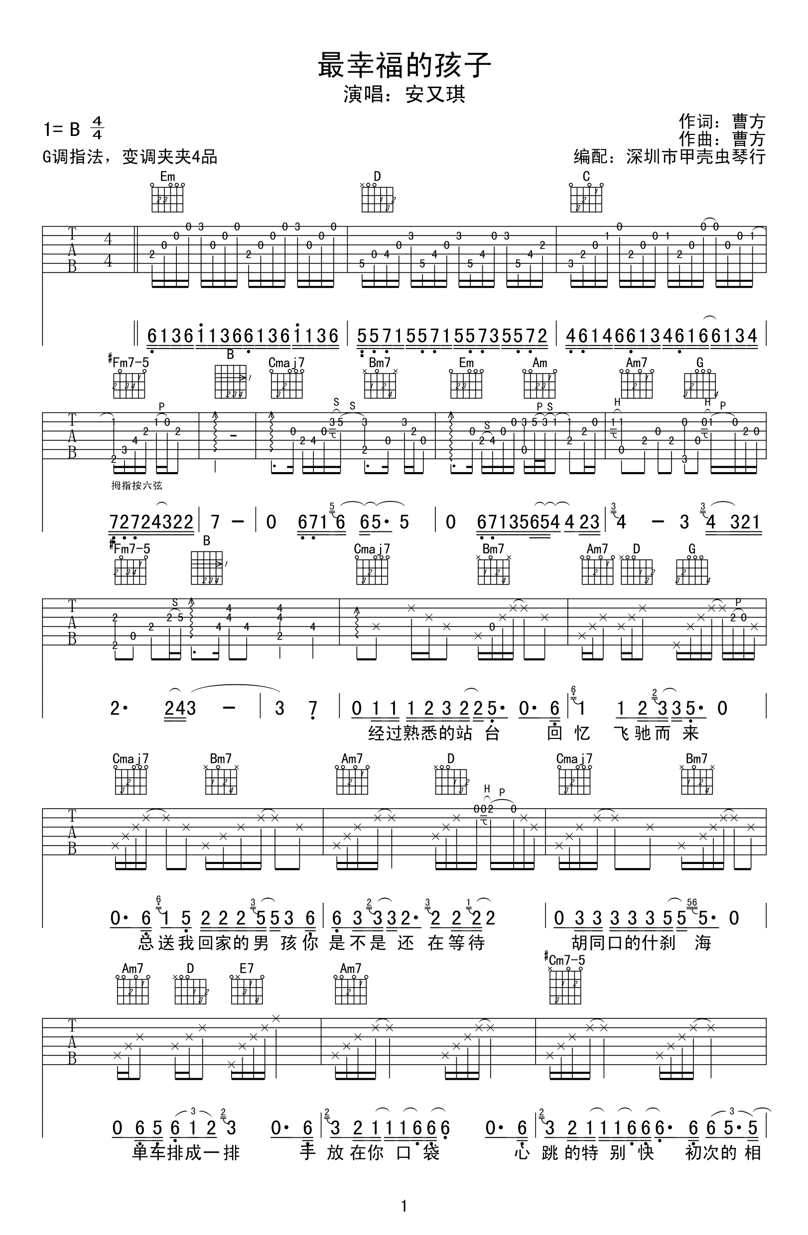 最幸福的孩子吉他谱安又琪选G变调夹4品甲壳虫琴行编配。...