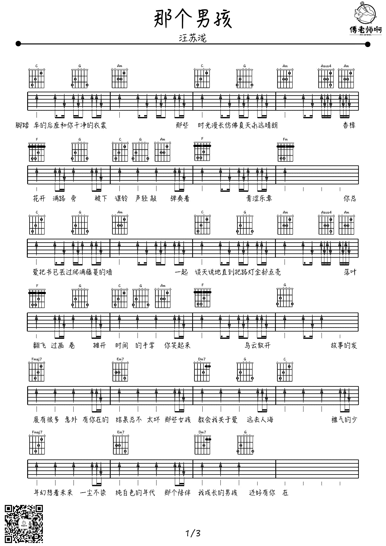 那个男孩吉他谱汪苏泷《夏至未至》电视剧插曲...