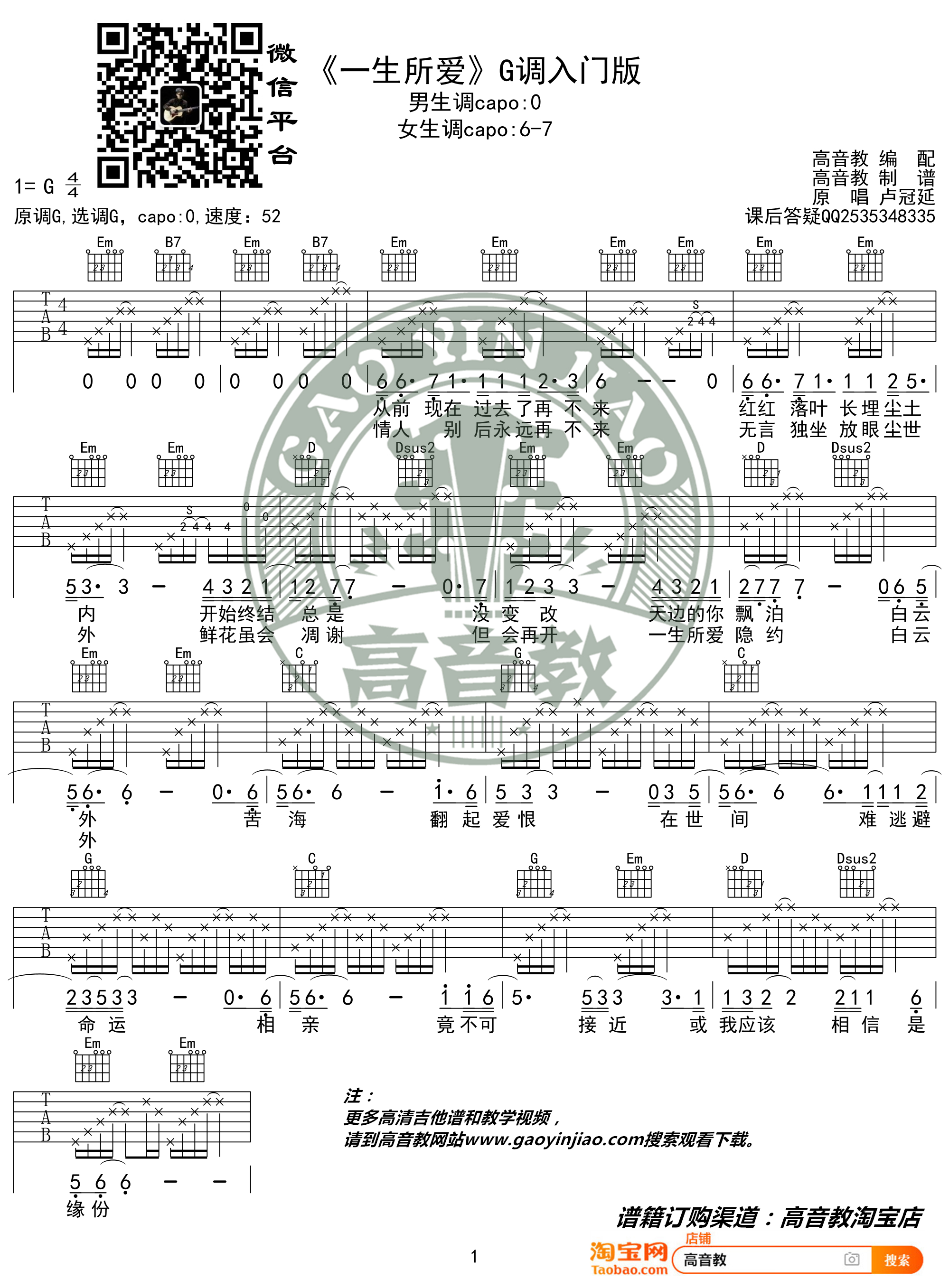 吉他卢冠廷《一生所爱》吉他谱