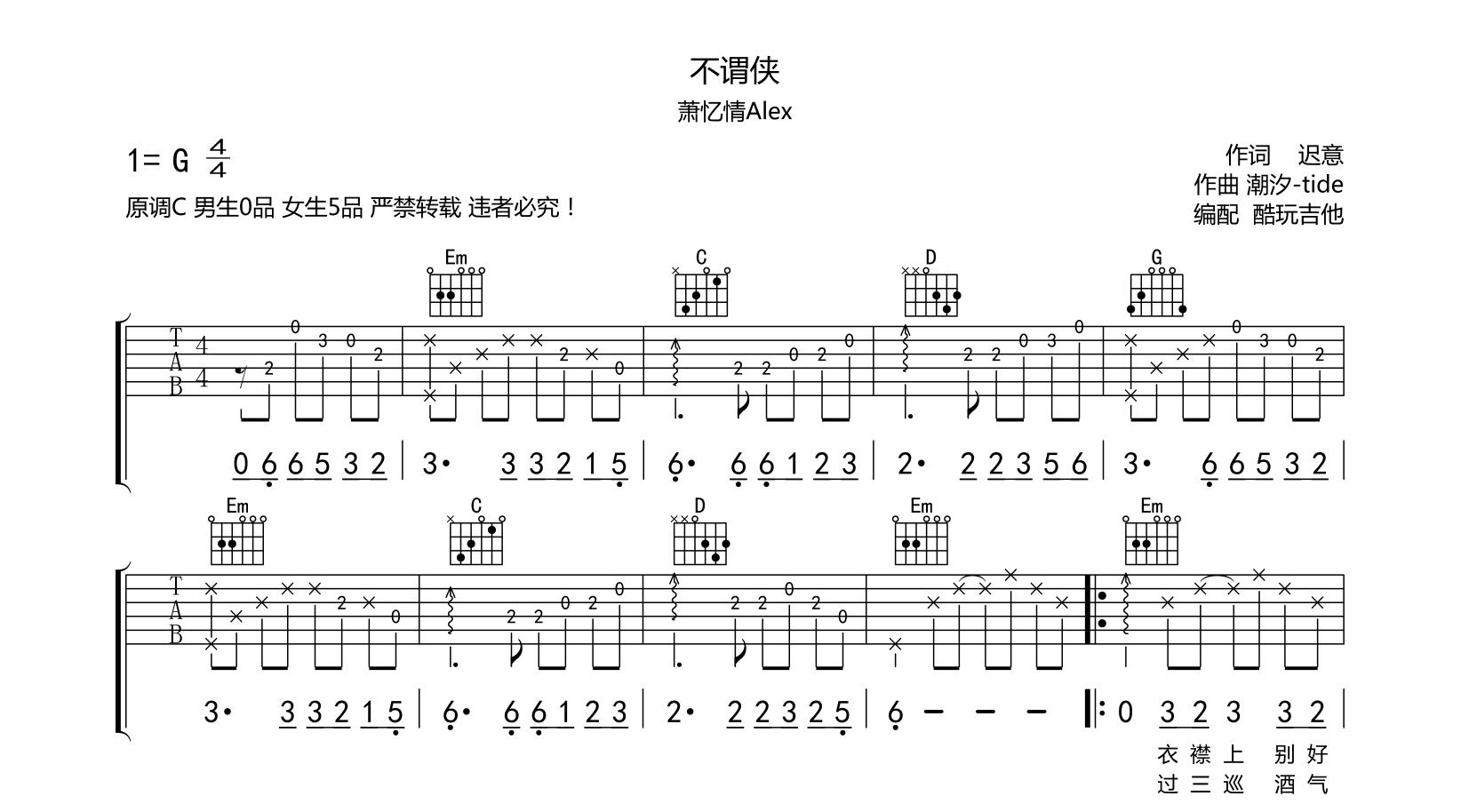 不谓侠吉他谱弹唱萧忆情Alex古风歌曲抖音热门音频试听只有部分请谅解附带前奏间奏变调夹女生版5品男生版0品...
