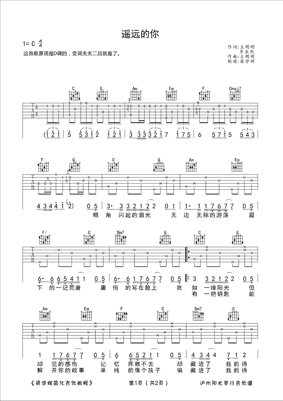 陈曦《遥远的你》吉他谱选调C调,原调为D调,吉他谱调为C调指法,节拍为4/4拍,弹唱的时候可以使用变调夹夹二品。...