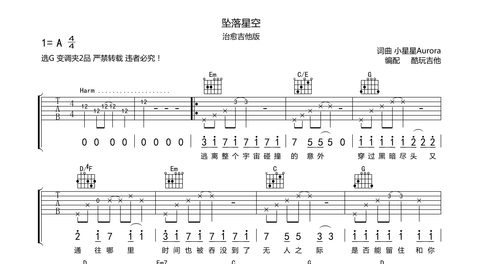 坠落星空吉他谱治愈吉他版小星星Aurora原版编配,原调A变调夹2品选G注:Harm自然泛音技巧,请参考网上自然泛音演奏方法。...