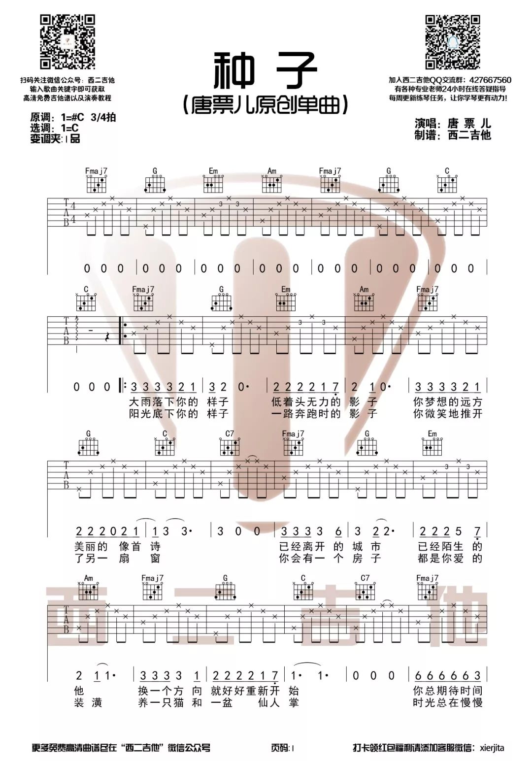 唐票儿《种子》吉他谱原调C#选C变调夹1品...