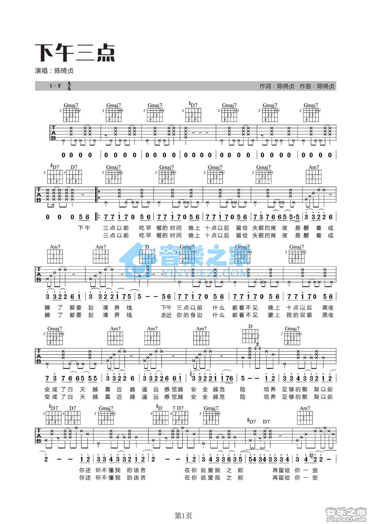 F调版陈绮贞《下午三点》吉他弹唱六线谱...