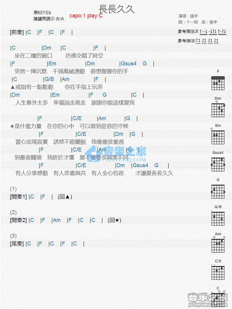 C调版张宇《长长久久》吉他和弦弹唱谱...