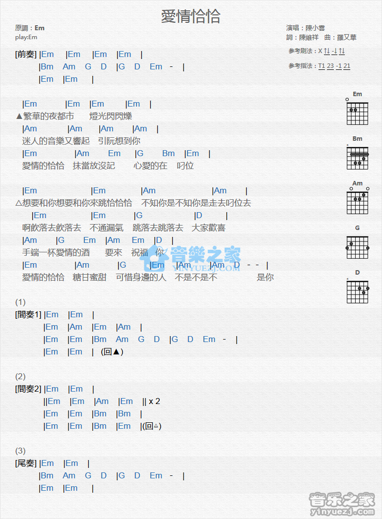 Em调版陈小云《爱情恰恰》吉他和弦弹唱谱...