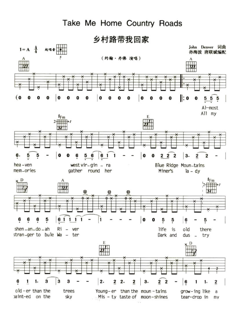 TakeMeHomeCountryRoad吉他谱,约翰丹佛演唱,乡村路带我回家吉他弹唱谱,由孙海波唐联斌六线谱编配,一首中国人最熟悉的美国乡村歌曲,轻快的节奏中却透出一丝淡淡的忧伤,满载往昔的回忆,一同怀念带我回家的乡村小路。TakeMeHomeCountryRoad(吉他谱),...