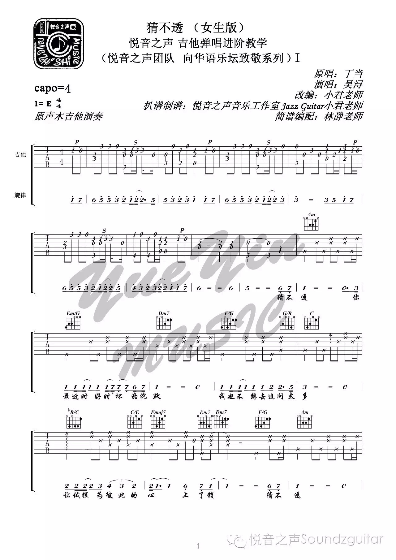 吉他丁当《猜不透》吉他谱_吉他弹唱谱_悦音之声--林静编配