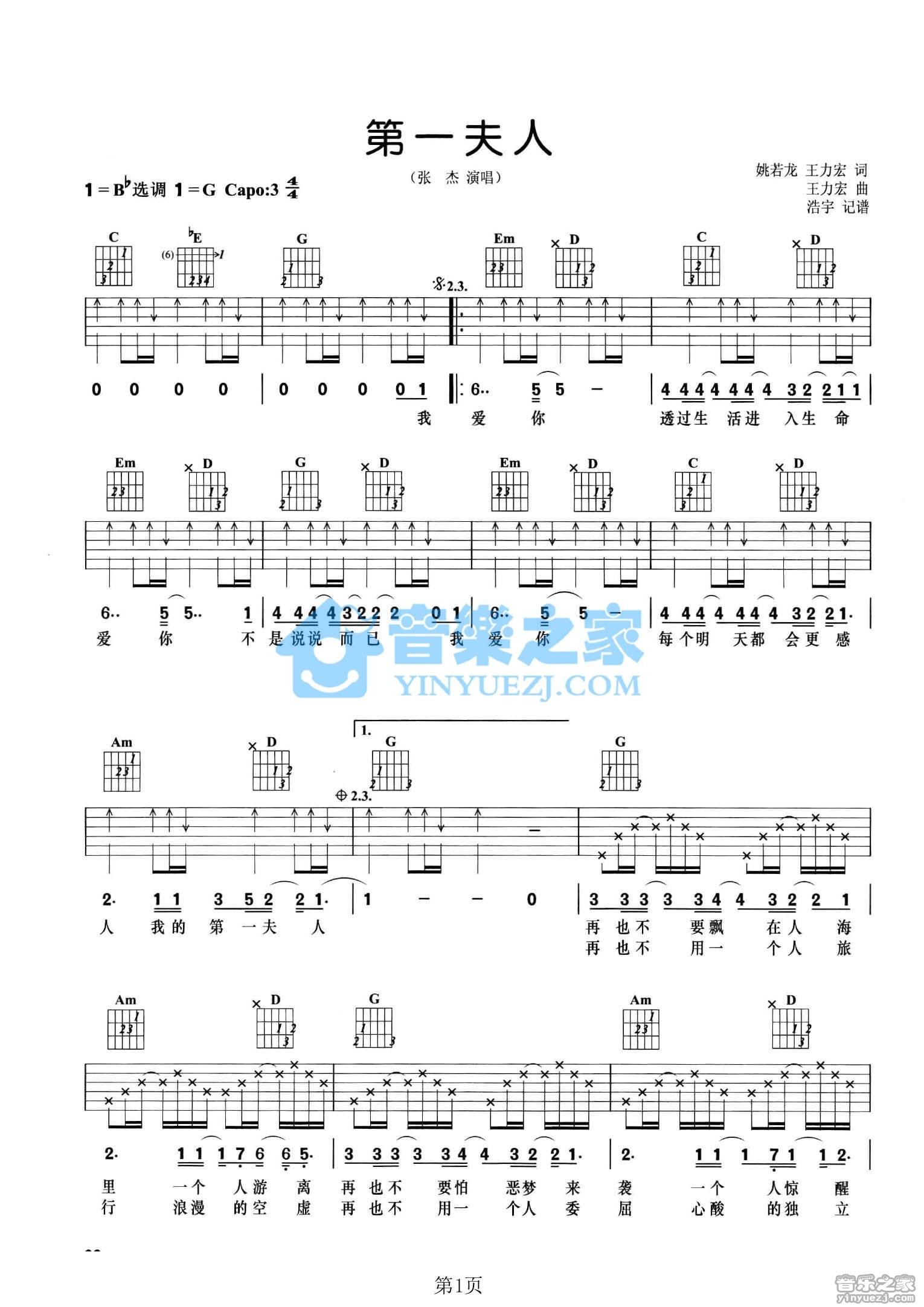 G调版张杰《第一夫人》吉他弹唱六线谱...