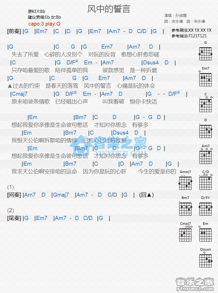 吉他孙淑媚《风中的誓言》吉他谱_吉他弹唱谱_YYZJ编配