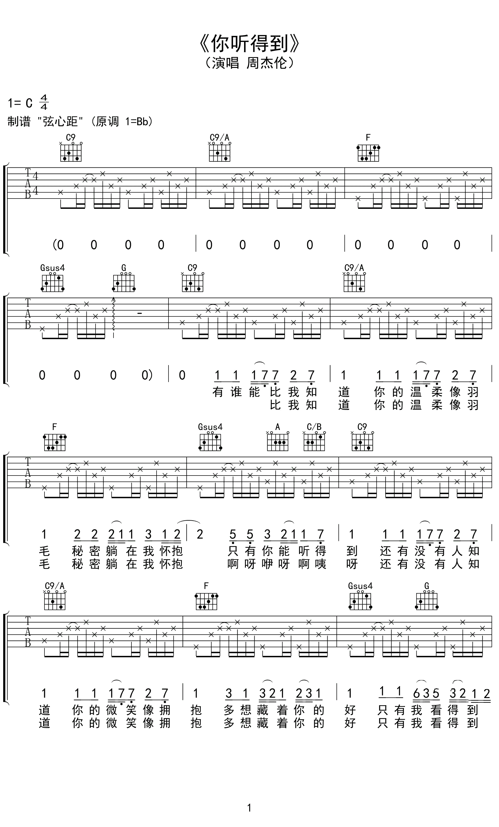 吉他周杰伦《你听得到》吉他谱_吉他弹唱谱_弦心距编配
