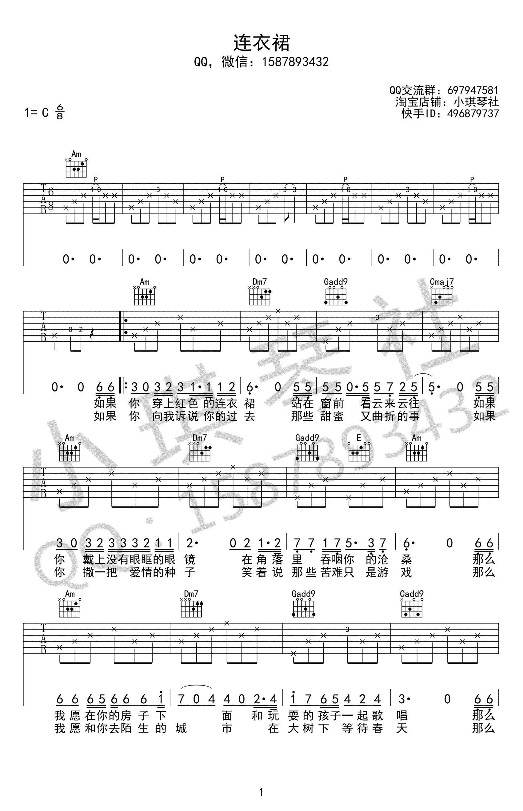 《连衣裙》吉他谱,共有3张高清图谱。...
