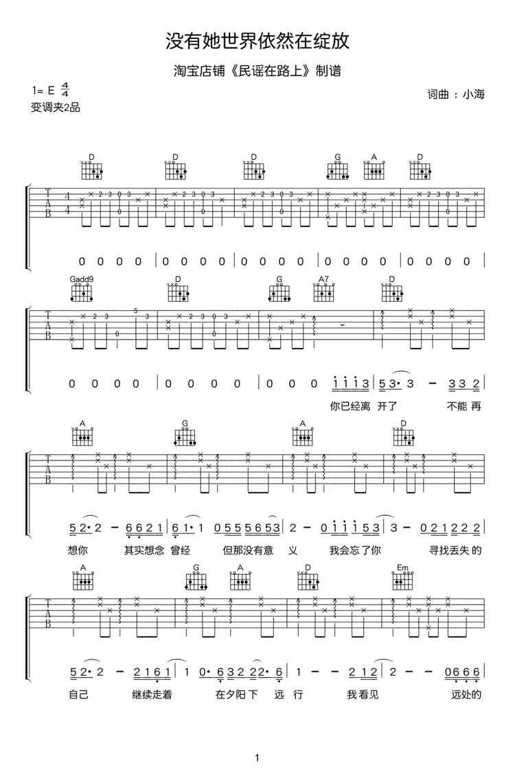 《没有她世界依然在绽放》吉他谱,共有5张高清图谱。...