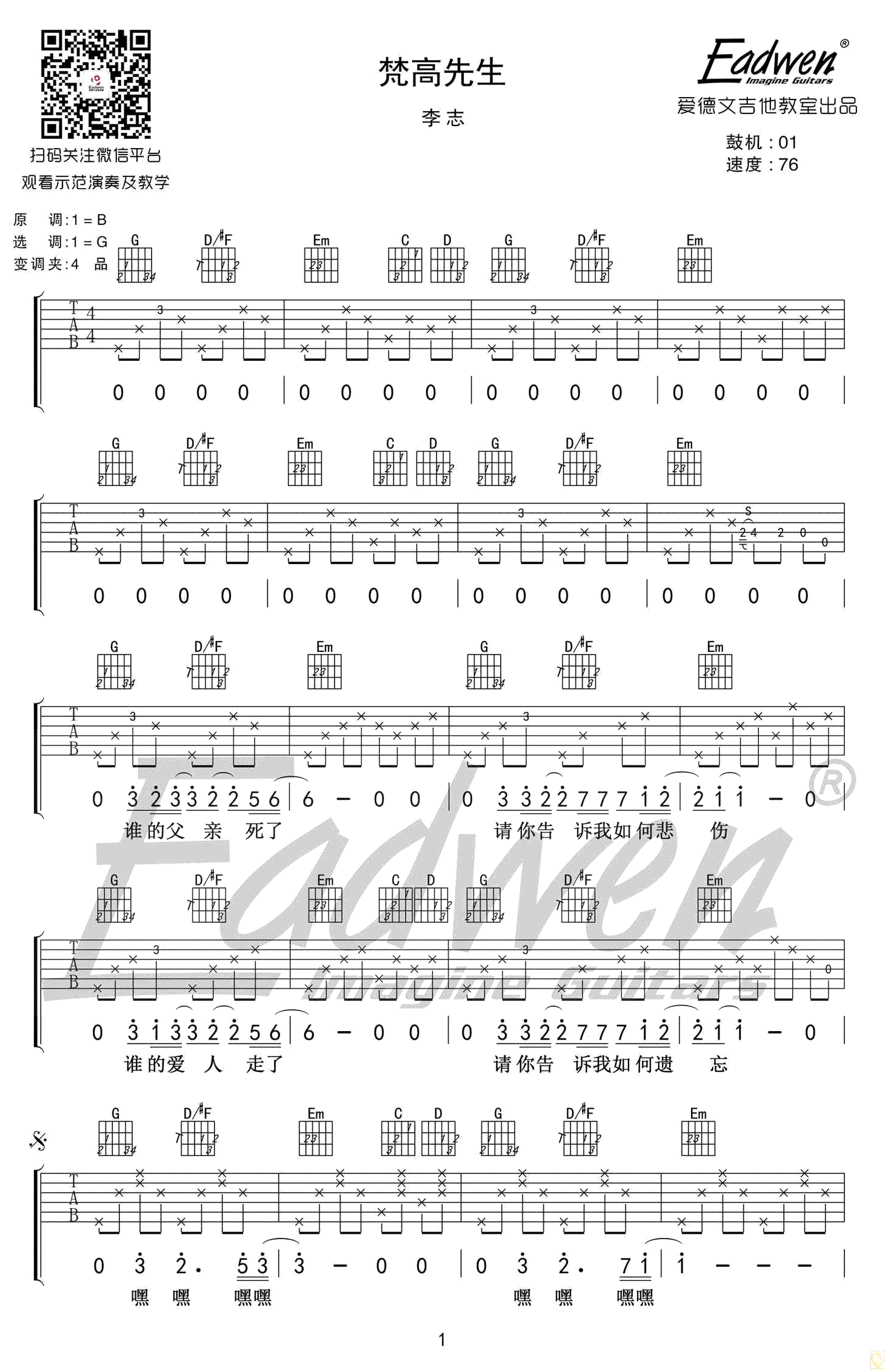 《梵高先生》吉他谱,共有3张高清图谱。...