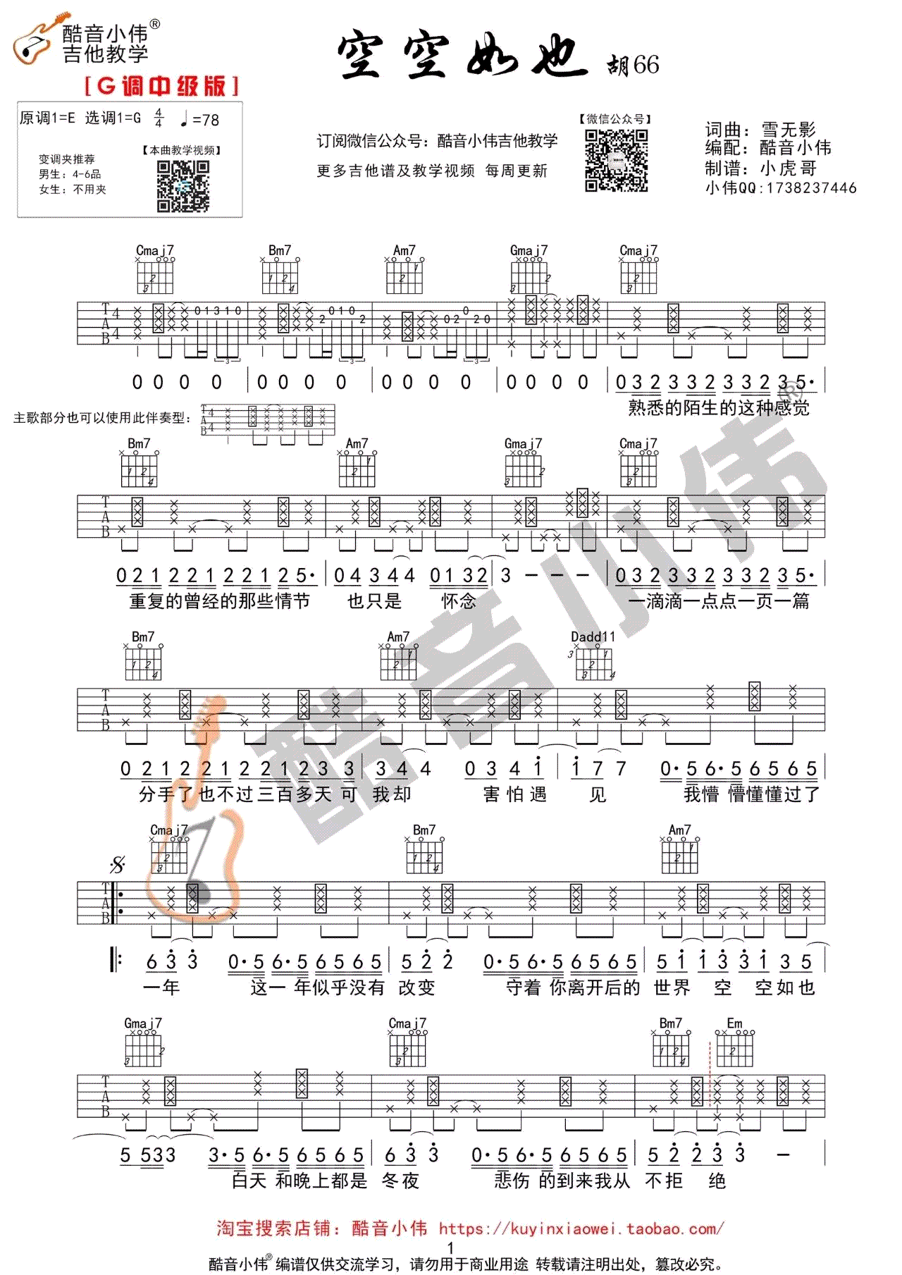 《空空如也》吉他谱,共有2张高清图谱,免翻页排版设计。...