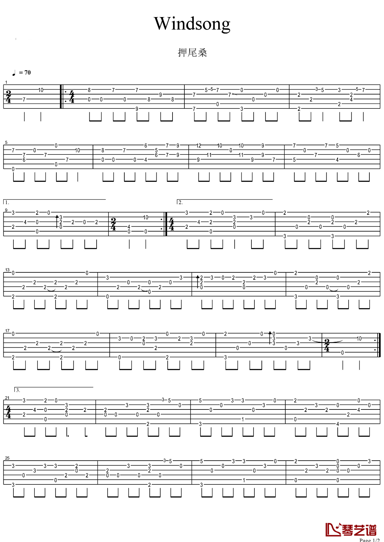 《WindSong指弹谱押尾桑风之诗》吉他谱,共有2张高清图谱,免翻页排版设计。...