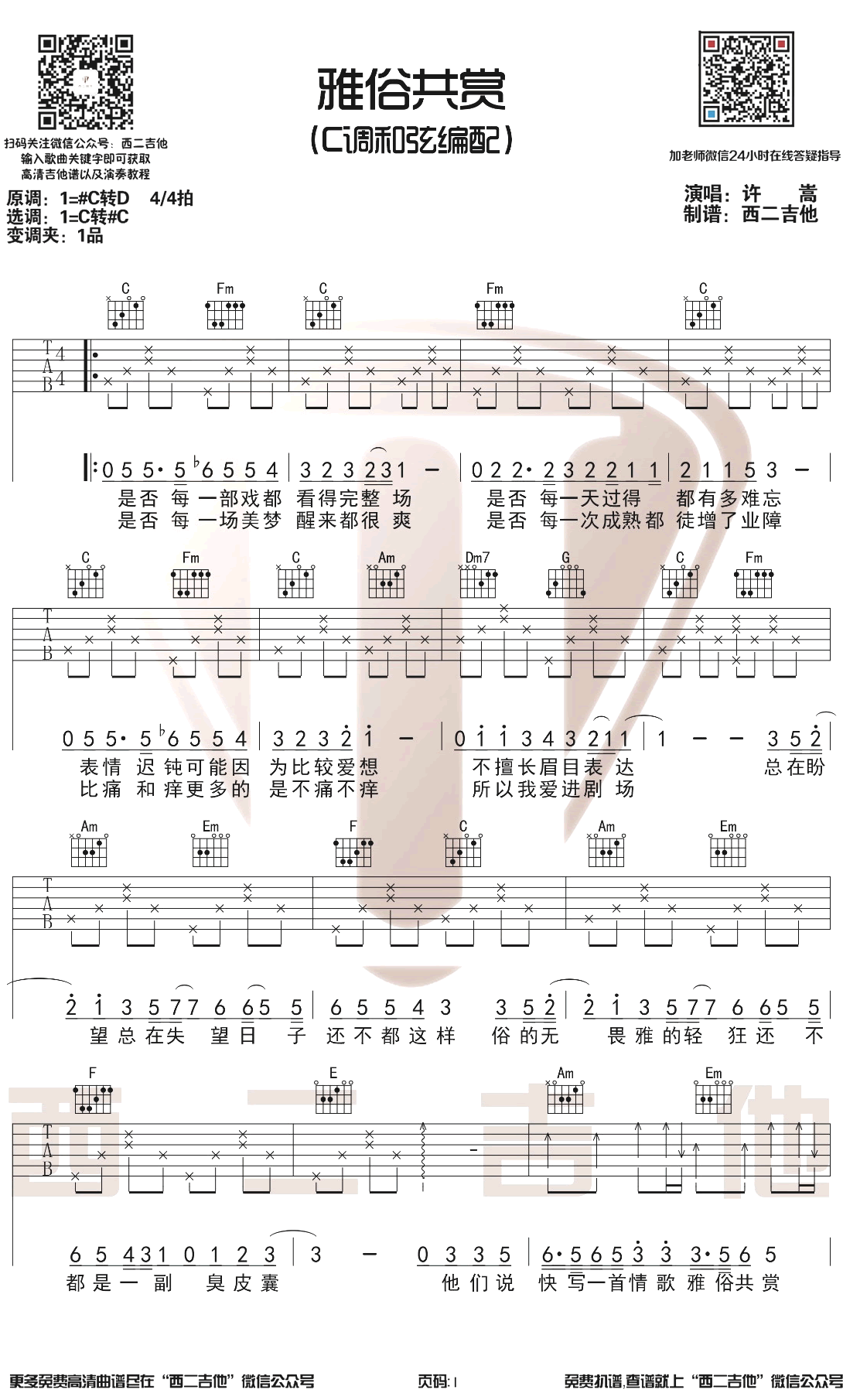 《雅俗共赏》吉他谱,共有2张高清图谱,免翻页排版设计。...