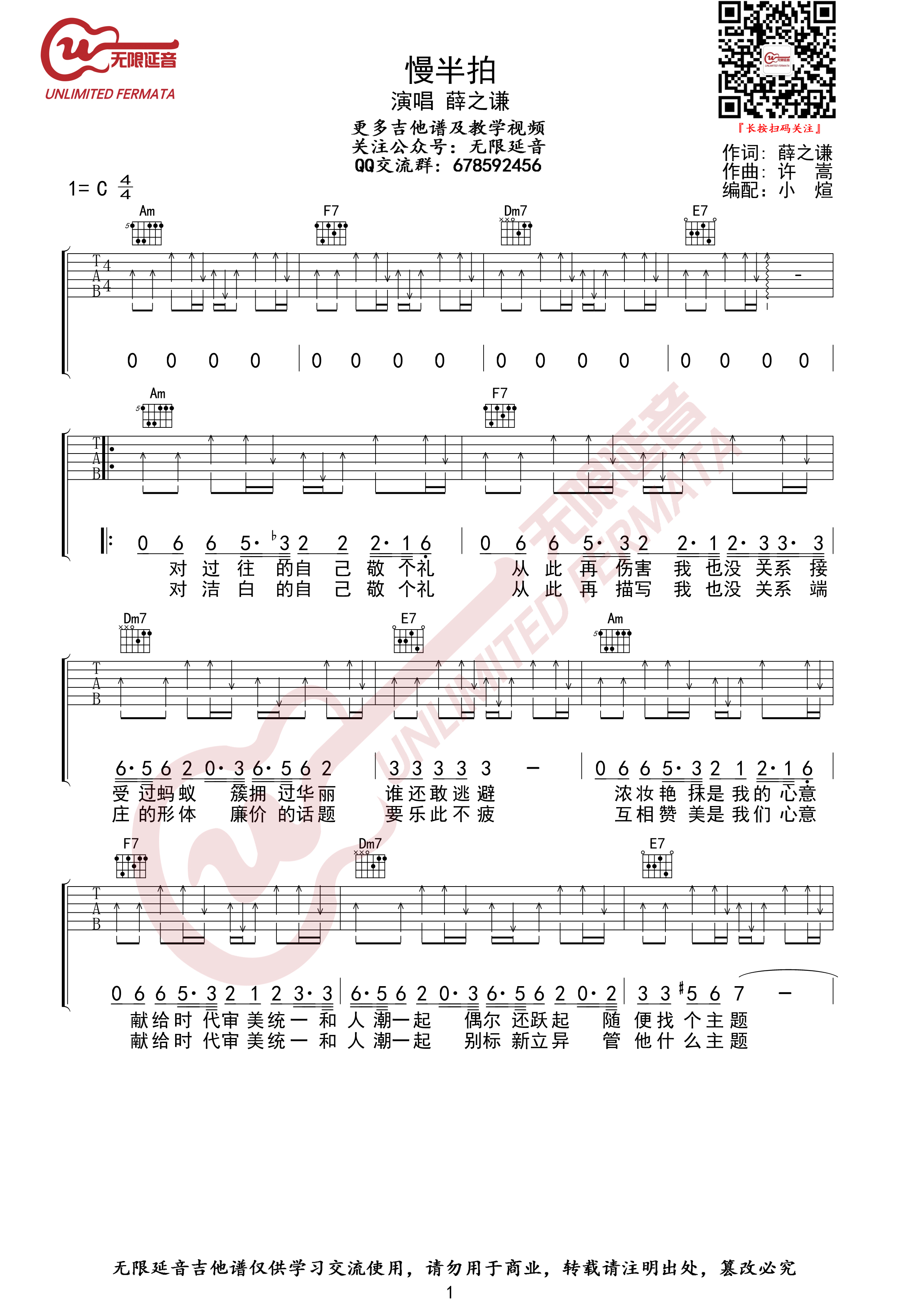 吉他慢半拍吉他谱 C调指法 薛之谦 两个版本