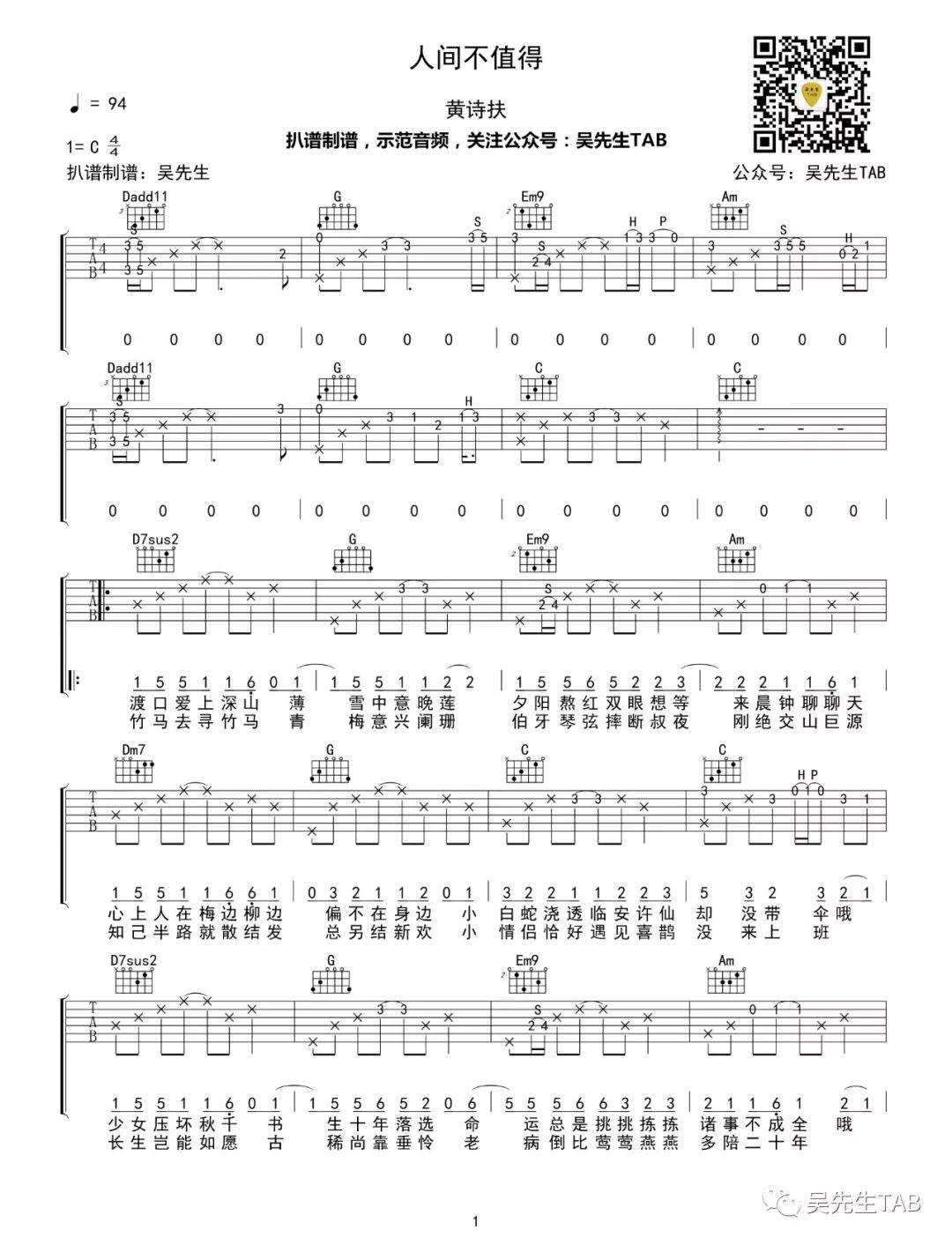 吉他人间不值得 吉他谱 黄诗扶