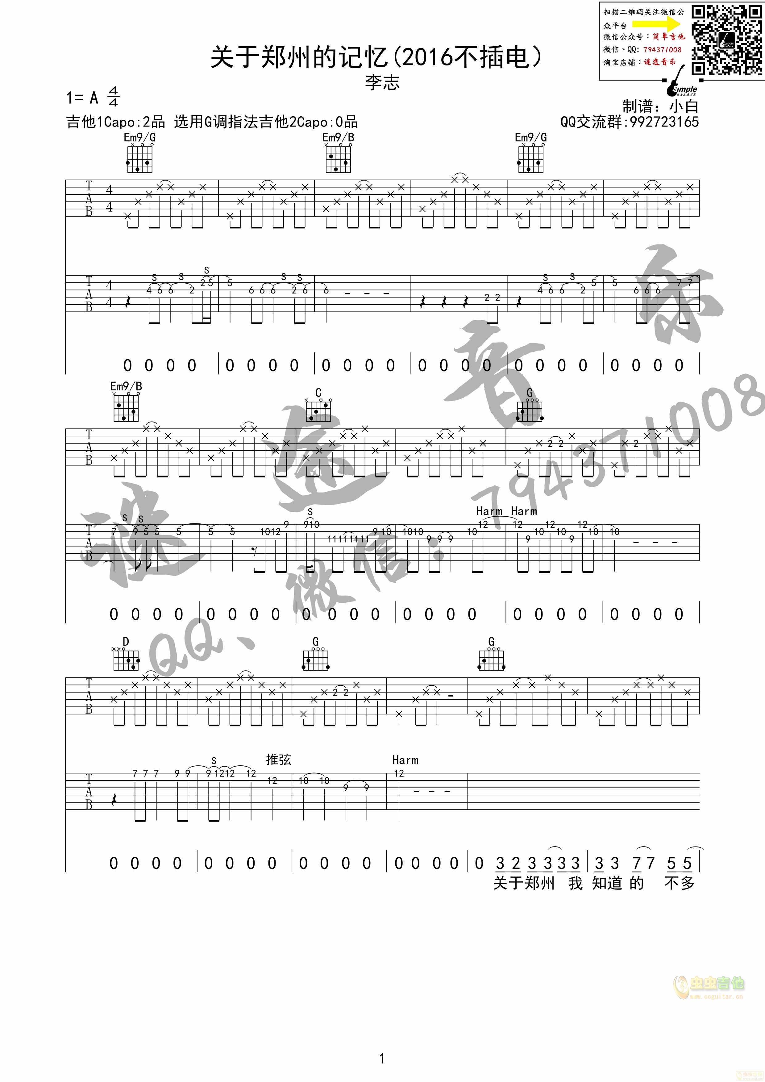 《关于郑州的记忆-李志(2016不插电)》吉他谱,共有4张高清图谱。...