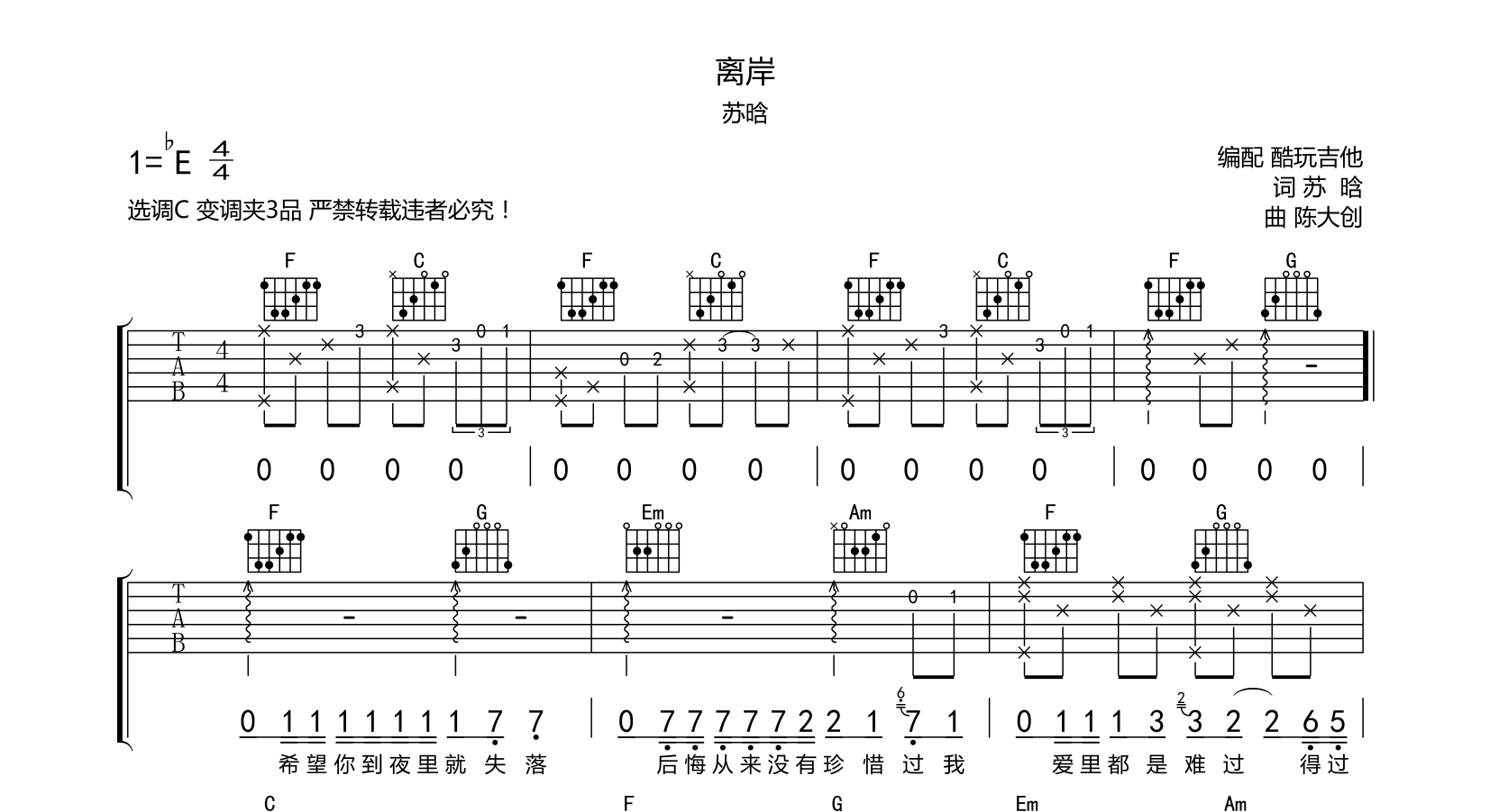 吉他离岸 吉他谱 苏晗 抖音热门