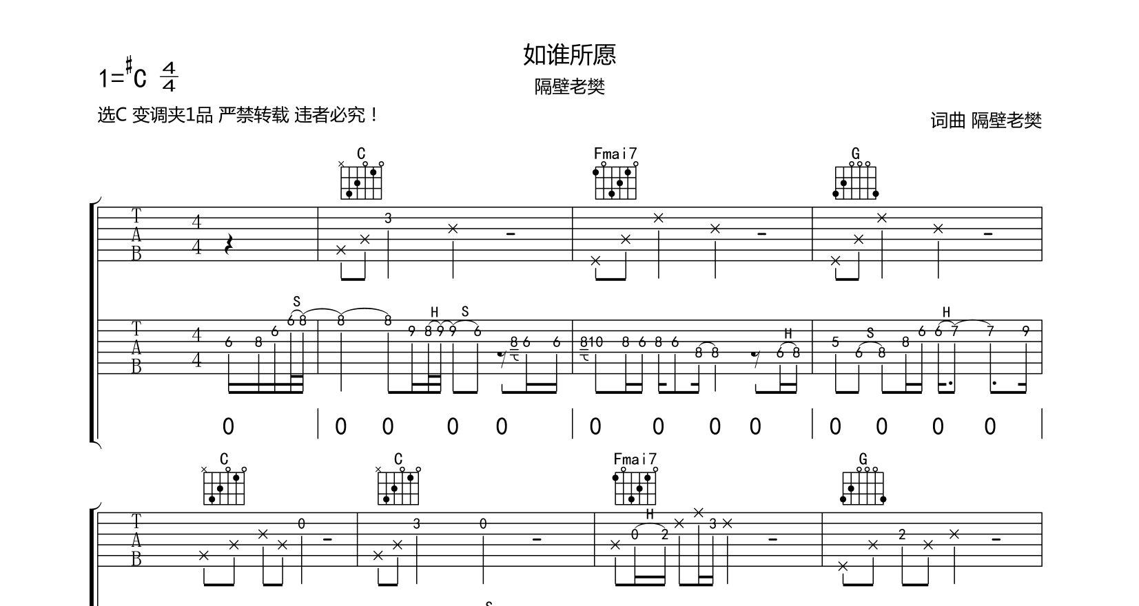 隔壁老樊如你所愿新版吉他谱还原...