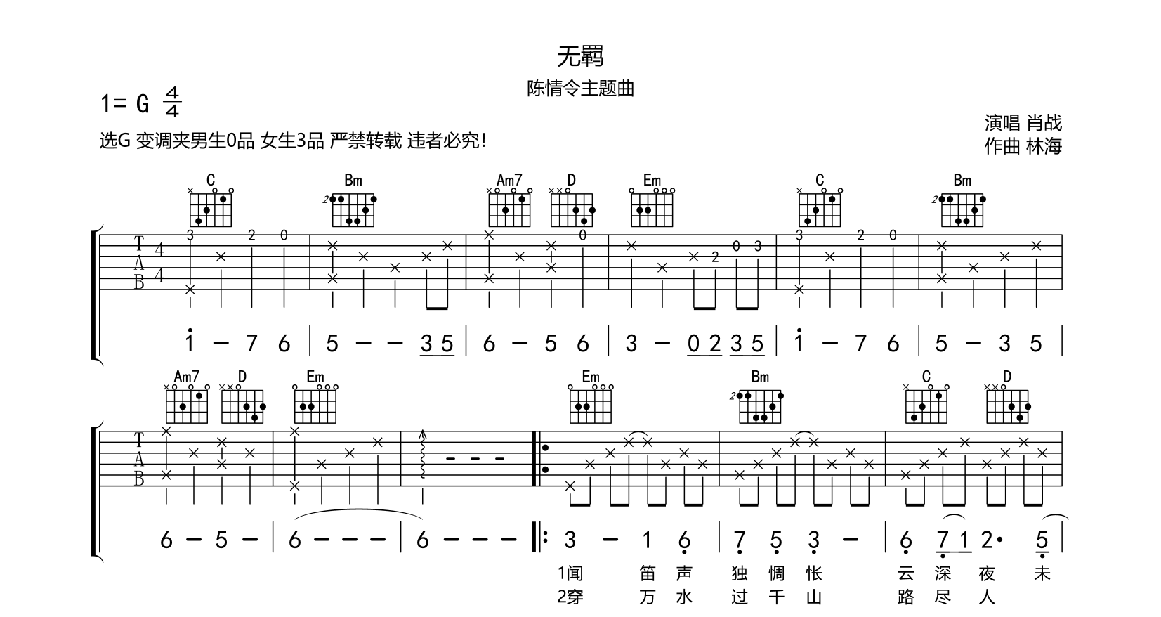 吉他无羁 吉他谱 陈情令主题曲