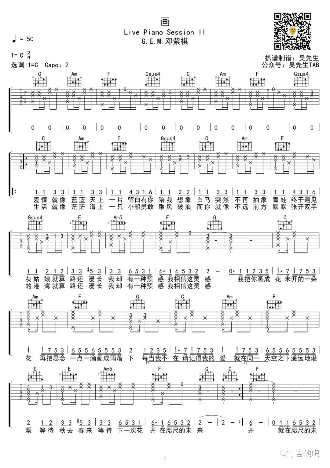 吉他邓紫棋《画》吉他谱 两个版本