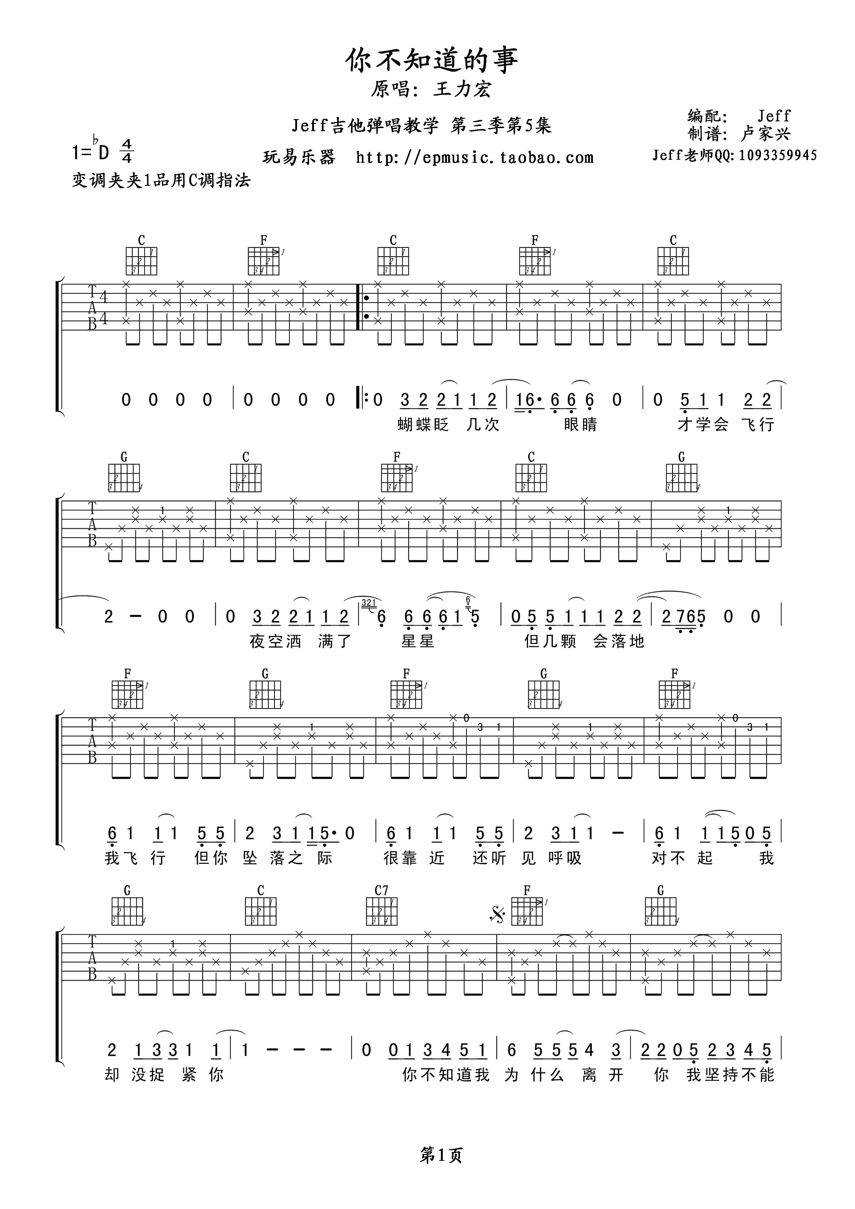 王力宏《你不知道的事》吉他谱,共有2张高清图谱,免翻页排版设计。...