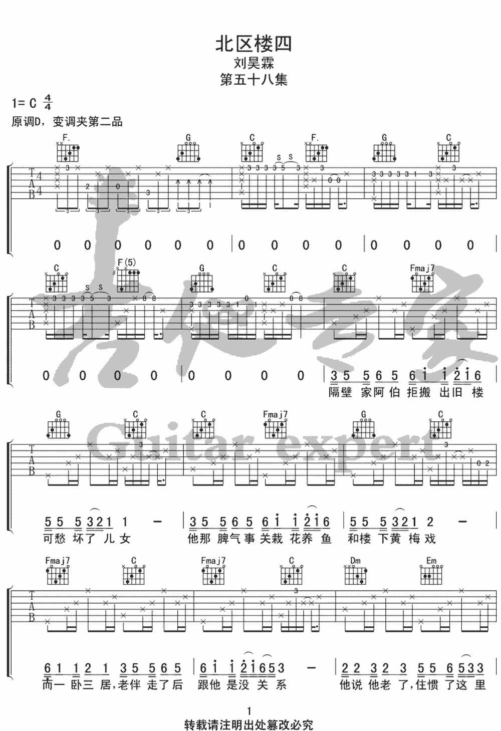 《北区楼四》吉他谱,共有4张高清图谱。...