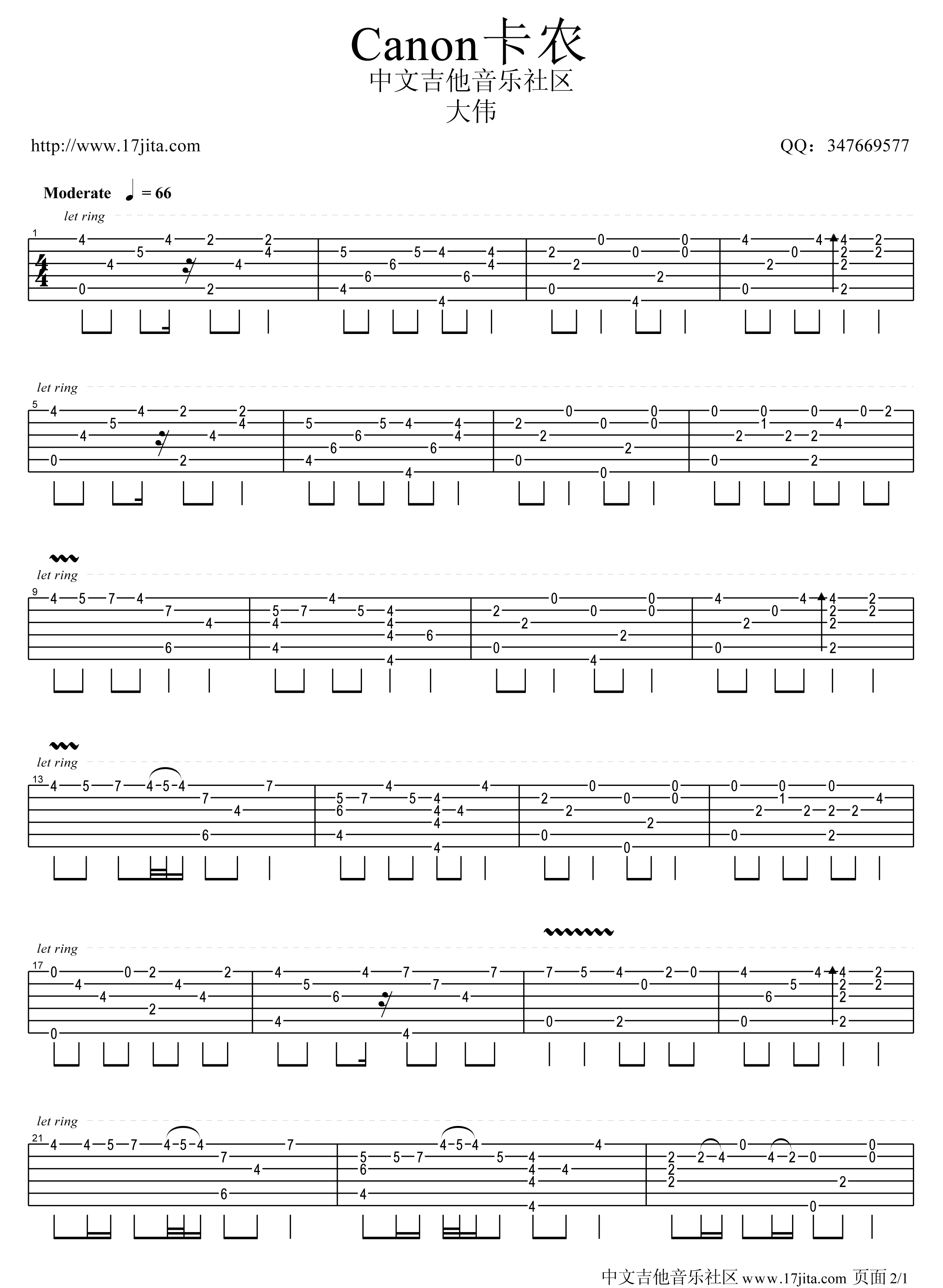 《Canon卡农E调》吉他谱,共有2张高清图谱,免翻页排版设计。...