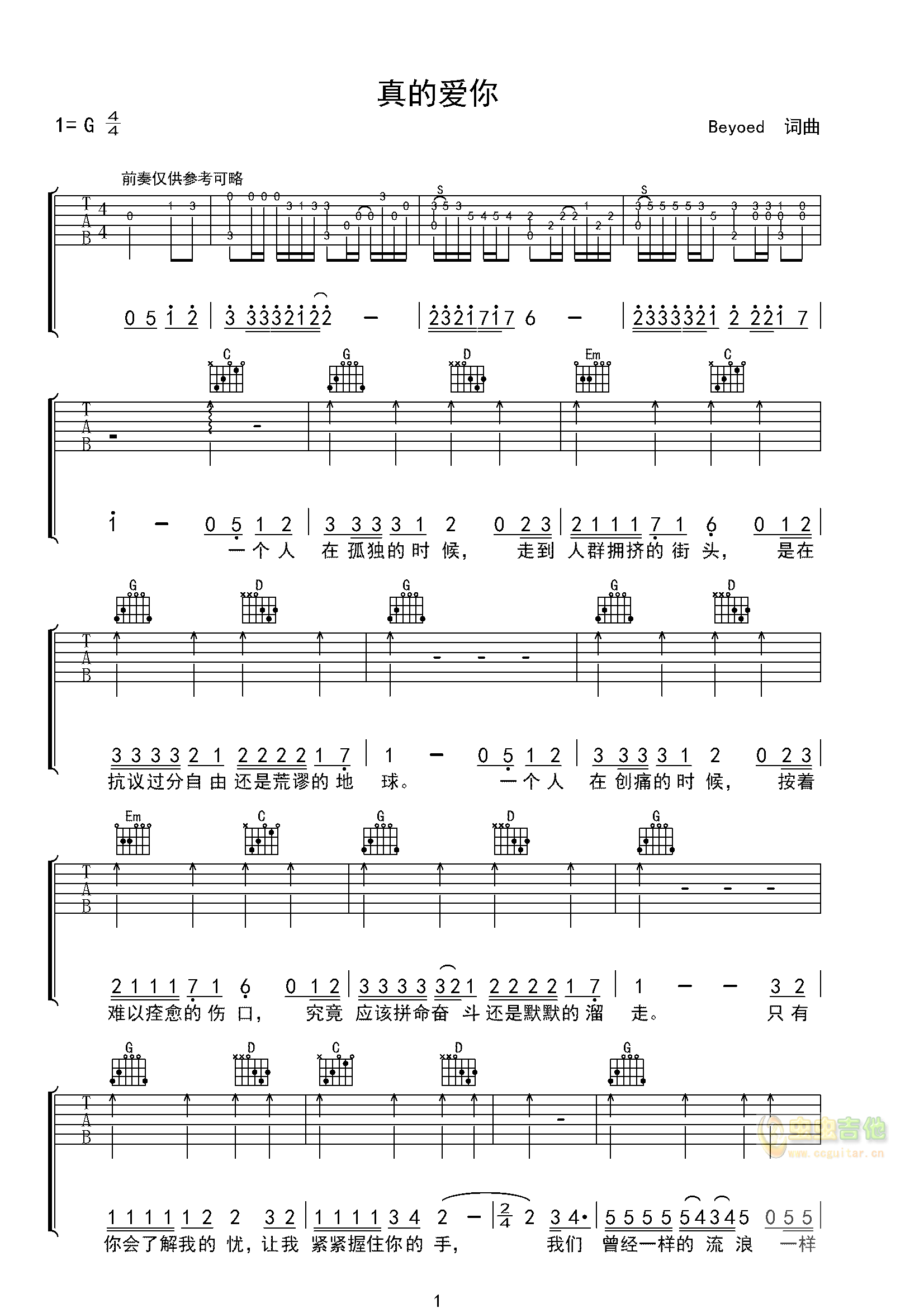 《真的爱你》吉他谱,共有2张高清图谱,免翻页排版设计。...