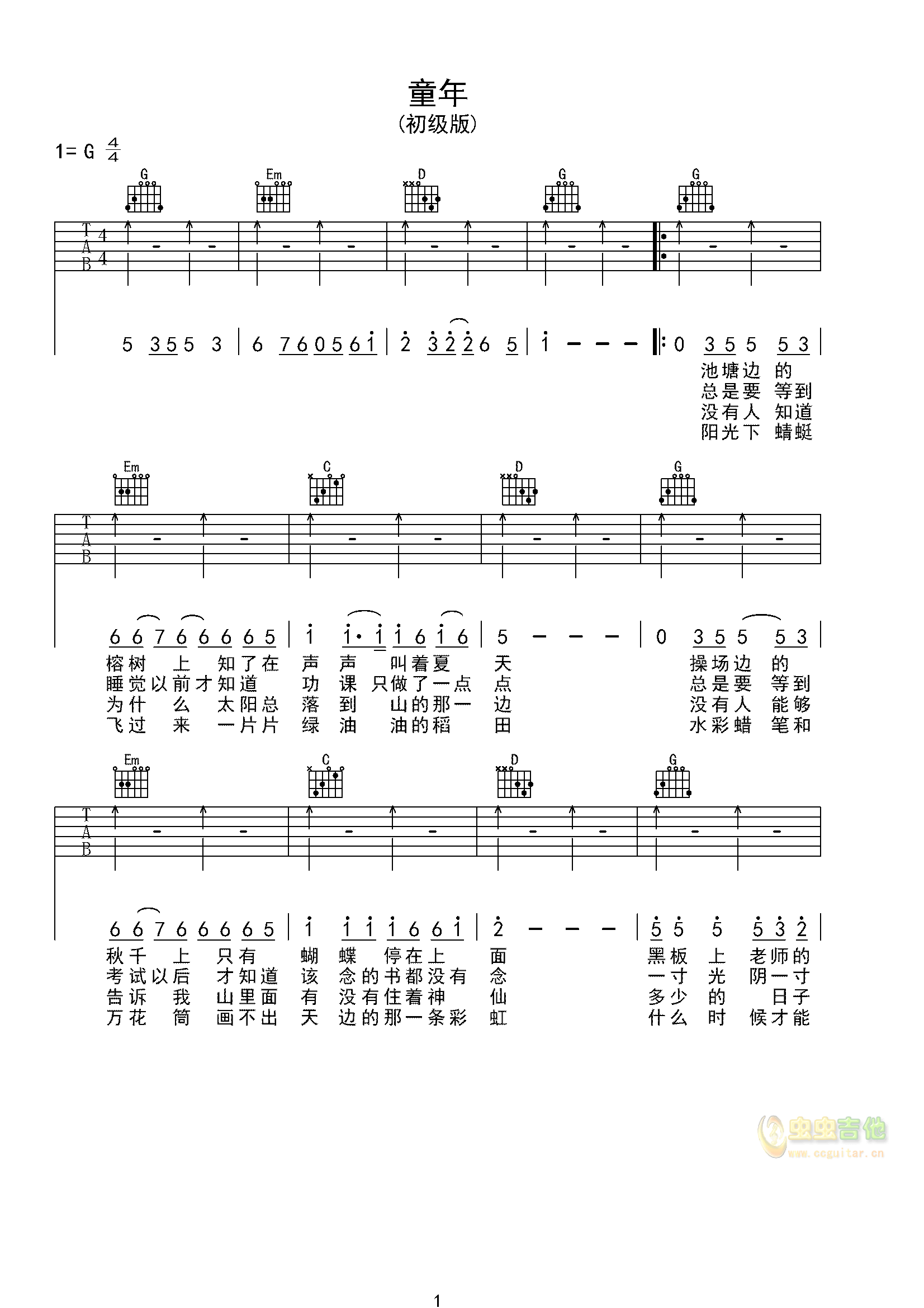 《童年-超新手简易版》吉他谱,共有2张高清图谱,免翻页排版设计。...