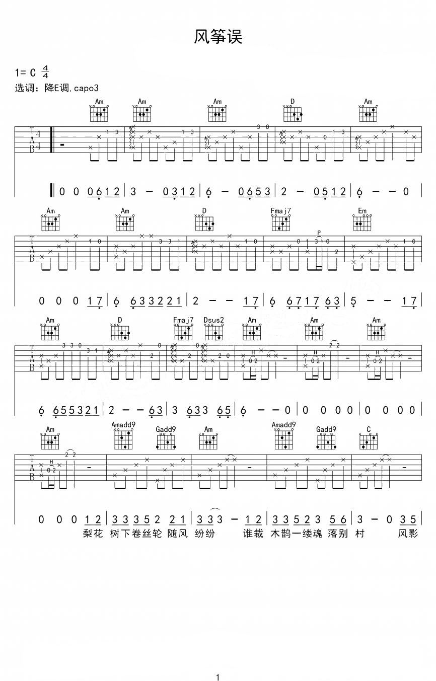 《风筝误》吉他谱,共有4张高清图谱。...