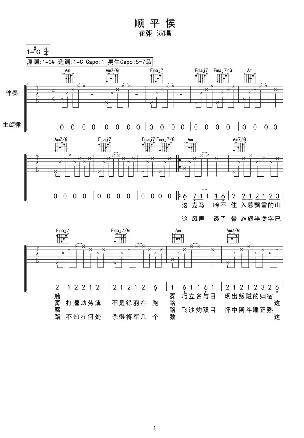 《顺平侯》吉他谱,共有3张高清图谱。...