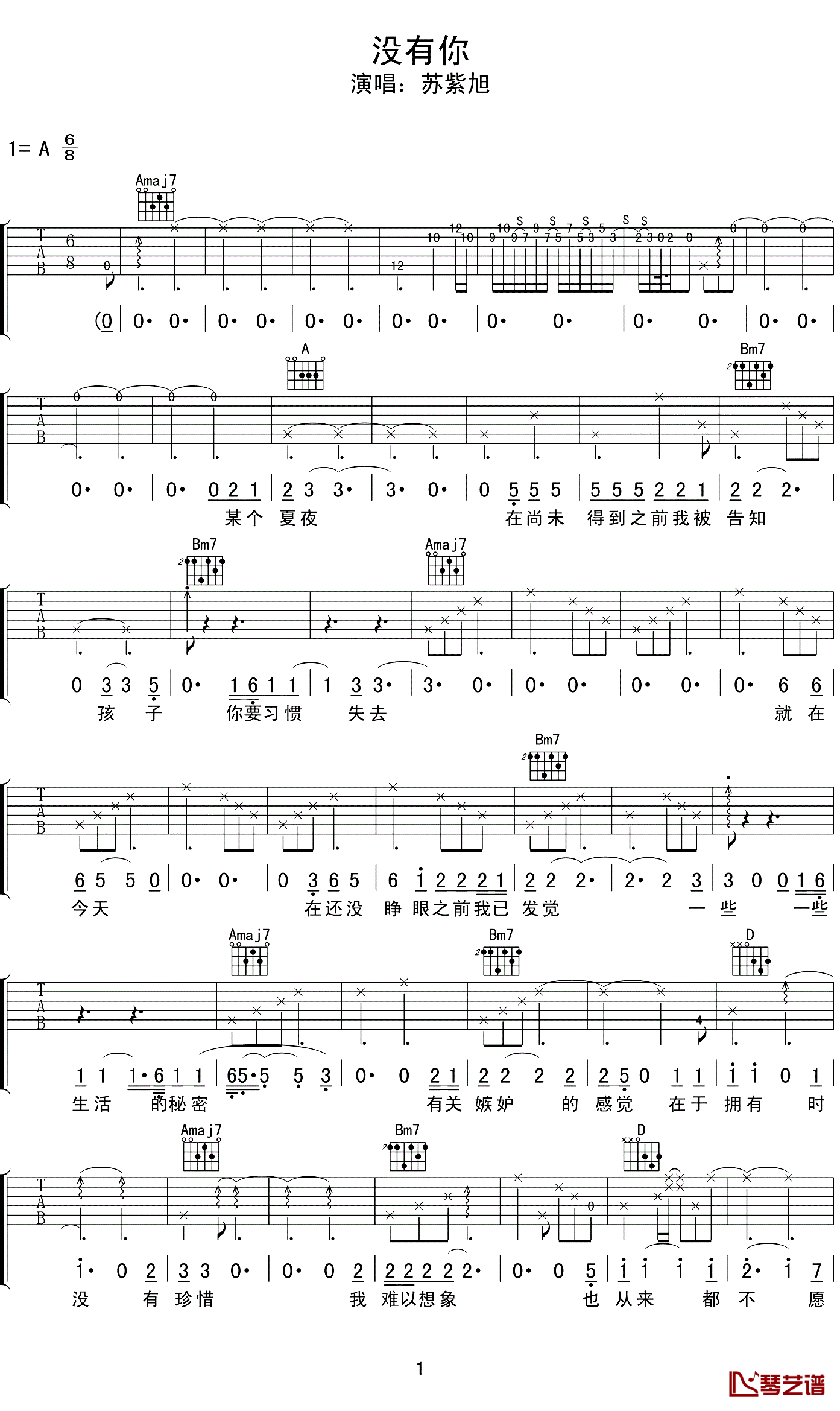 吉他没有你吉他谱-苏紫旭