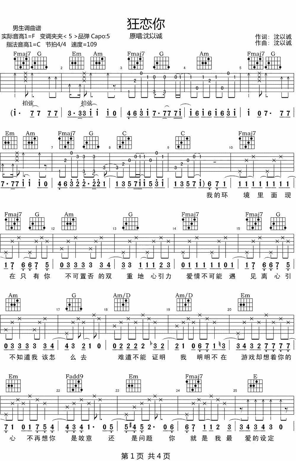 沈以诚《狂恋你》吉他谱...