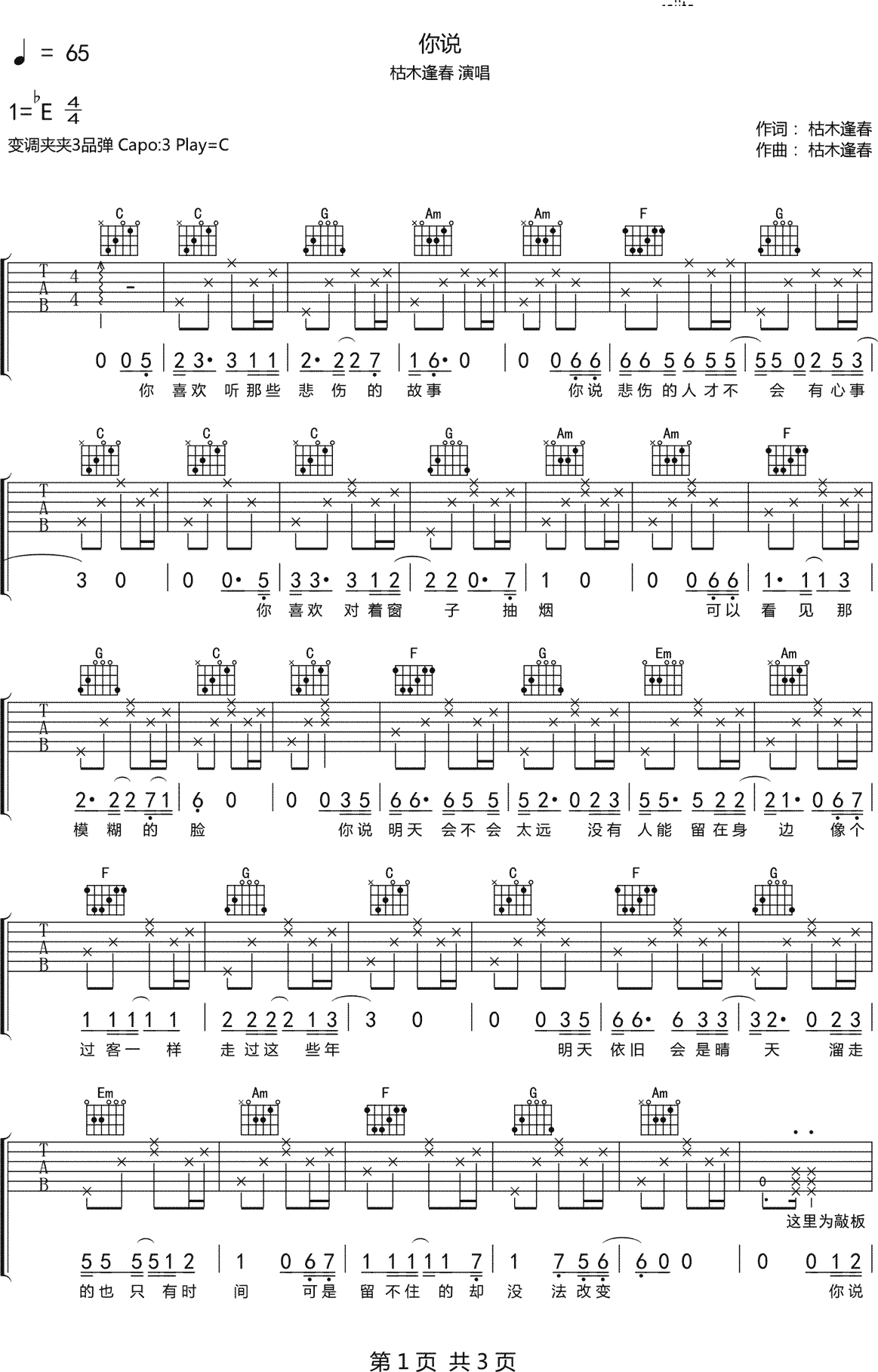你说吉他谱-枯木逢春...