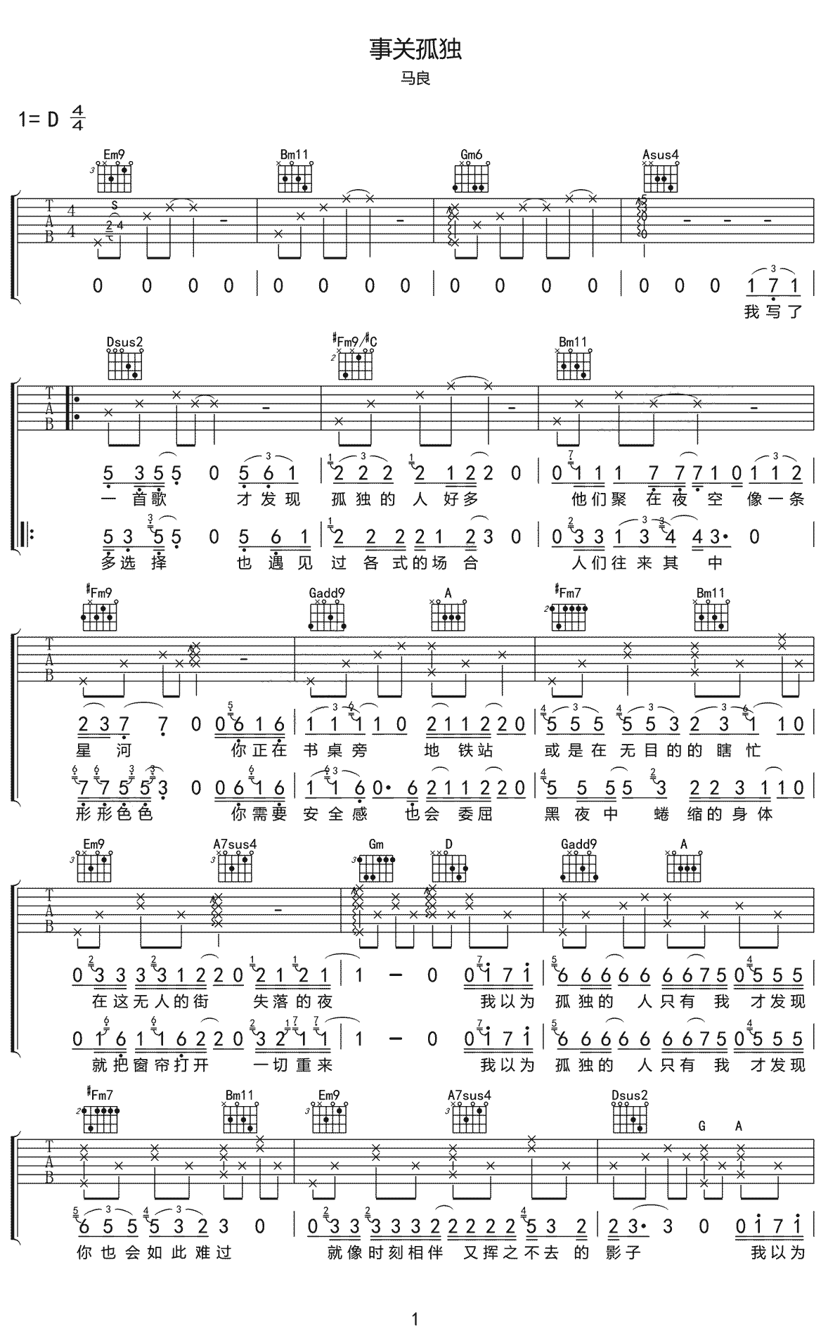 事关孤独吉他谱-马良...