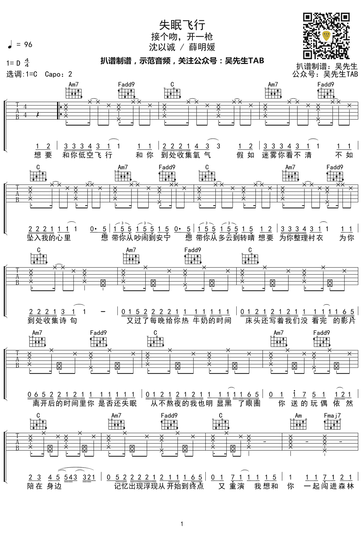 失眠飞行吉他谱-沈以诚/薛明媛...