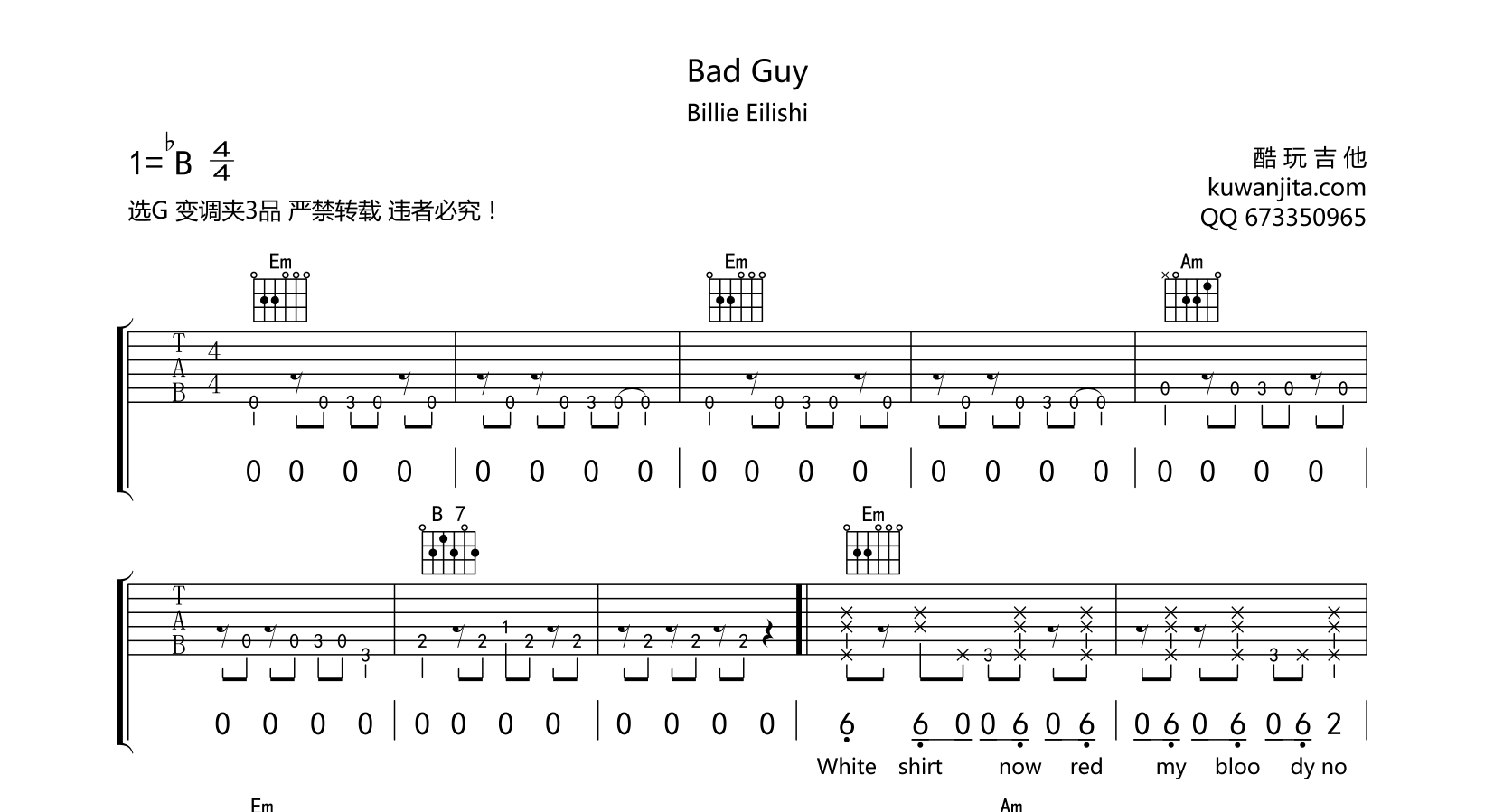 吉他Bad Guy 吉他谱 Billie Eilish
