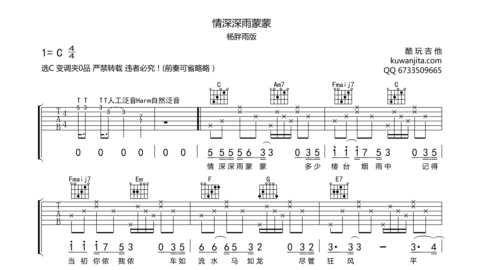 吉他情深深雨蒙蒙 吉他谱 杨胖雨
