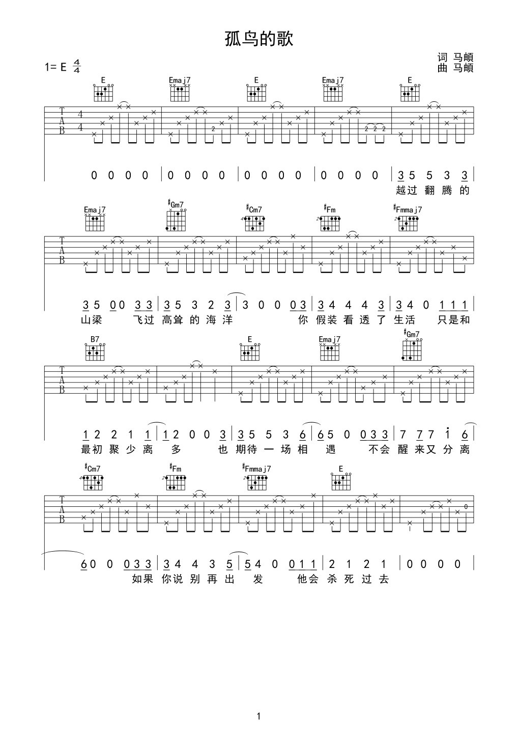 吉他马頔《孤鸟的歌》吉他谱_吉他弹唱谱