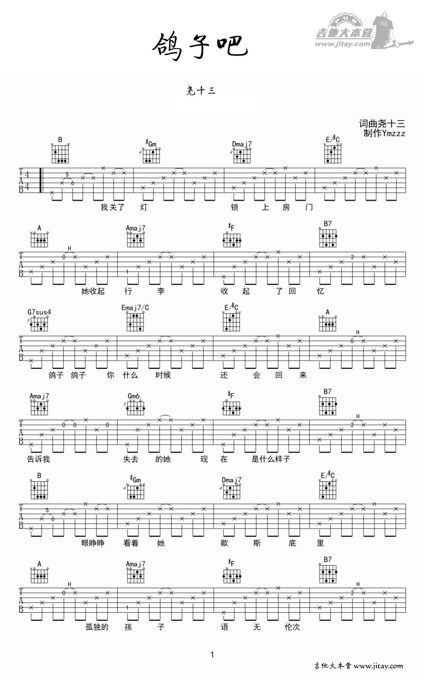 吉他尧十三《鸽子吧》吉他谱_吉他弹唱谱_吉他大本营Ymzzz编配