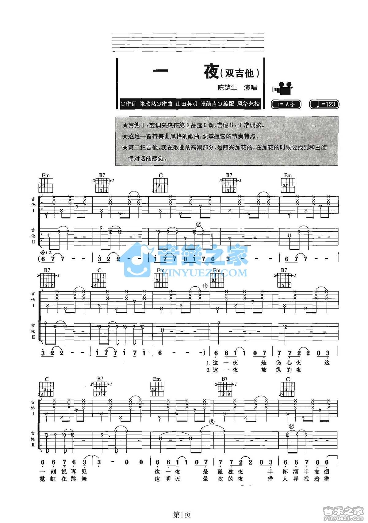G调双吉他版陈楚生《一夜》吉他弹唱六线谱...