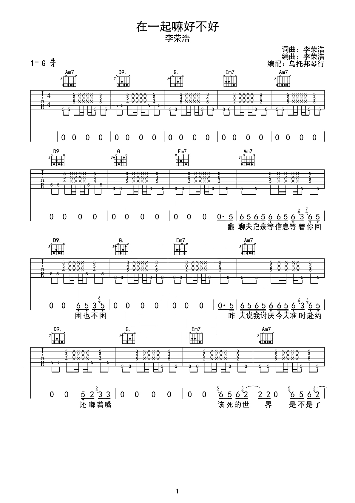 吉他李荣浩《在一起嘛好不好》吉他谱_吉他弹唱谱_乌托邦琴行编配