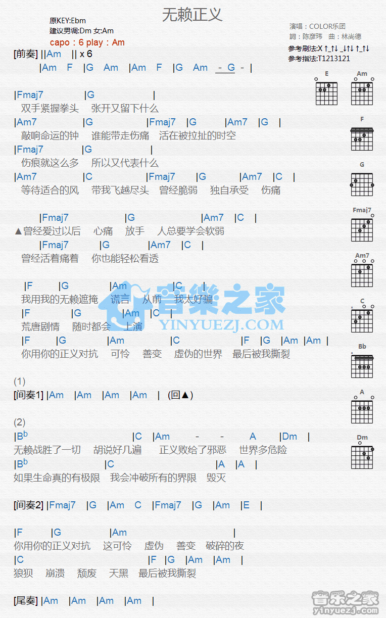 Am调版Color乐团《无赖正义》吉他和弦弹唱谱...