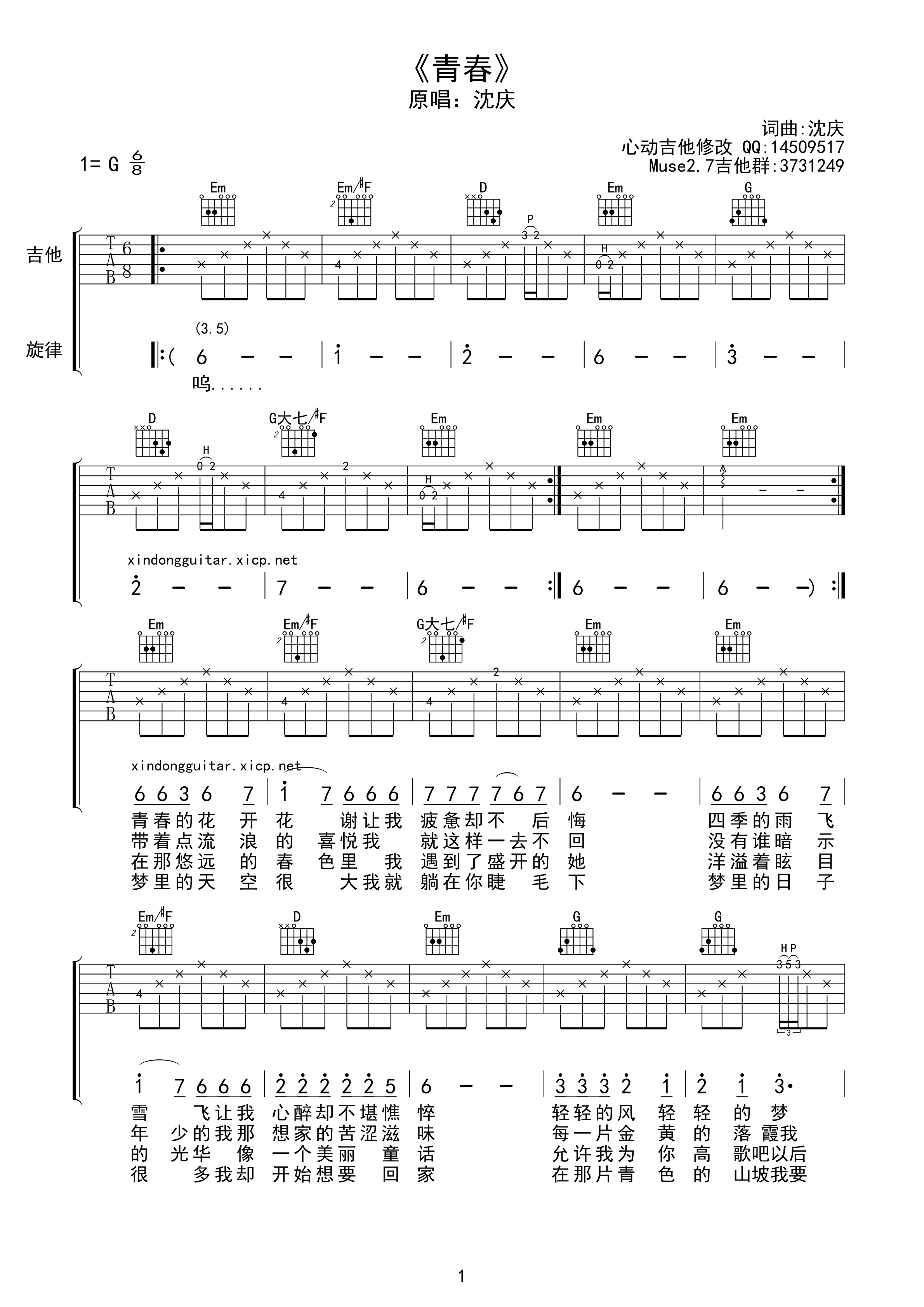 吉他沈庆《青春》吉他谱_吉他弹唱谱_心动吉他编配